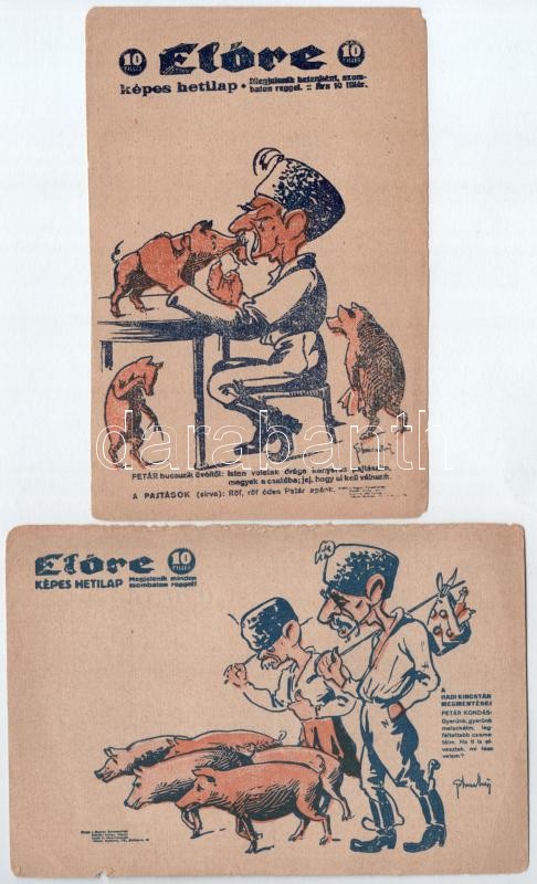 Petár kondás. "Előre" képes hetilap humoros karikatúrája I. Péter szerb királyról, szerbellenes propaganda / WWI Anti-Serbian mocking propaganda, military caricature of Peter I of Serbia, artist signed - 2 db régi képeslap / 2 pre-1945 postcards