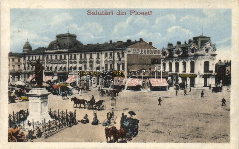 Ploiesti, Ploesti; Coroana, Líra, Banka, Panzaria Elvetiana, Trandfiru Rosu, La Hora Sinaiei, Panzaria Moderna, Primaria / square with town hall, shops and bank, market vendors