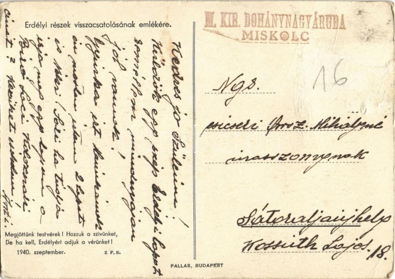 Erdélyi részek visszacsatolásának emlékére. Megjöttünk testvérek! Hozzuk a szívünket, de ha kell, Erdélyért adjuk a vérünket! / entry of the Hungarian troops to Transylvania, irredenta propaganda s: Németh N. (Rb)