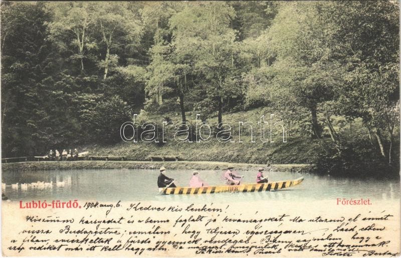 Beschreibung: 1904 Lublófüred, Lubló-fürdő, Kúpele Lubovna (Ólubló, Stará Lubovna); tó, főrészlet, csónak. Blatniczky István kiadása / lake, boat