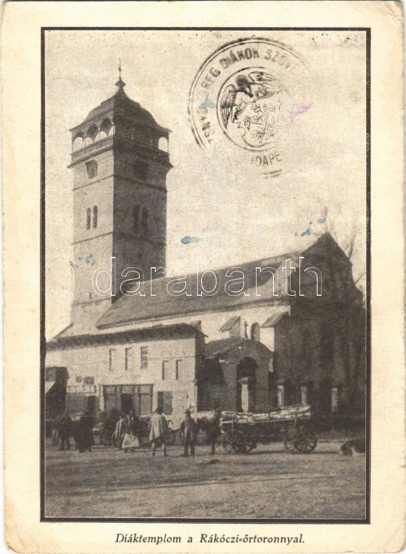 1928 Rozsnyó, Roznava; Diáktemplom a Rákóczi őrtoronnyal. A Rozsnyói Öregdiákok Szövetségének meghívója a hátoldalon / church, watchtower. Invitation on the backside (gyűrődés / crease)