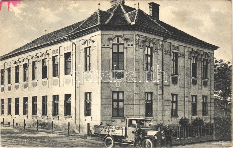 Tótmegyer, Slovensky Meder, Palárikovo; Slovenska Ludova Skola, Sklad piva / Szlovák elemi iskola, előtte K. Blaha sörraktárának teherautója / school, beer warehouse truck (fl)