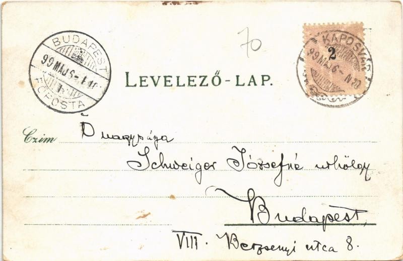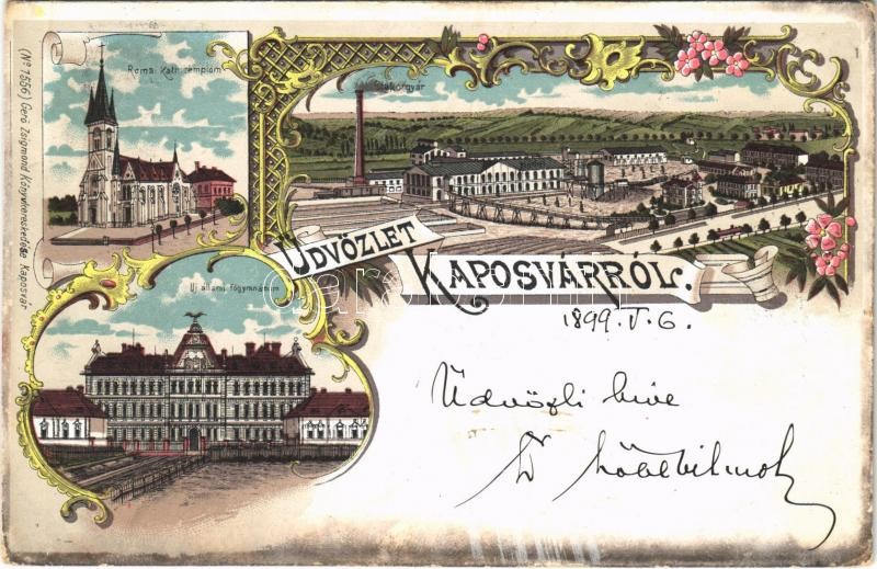 Beschreibung: 1899 Kaposvár, Római katolikus templom, Cukorgyár, Új állami főgimnázium. Gerő Zsigmond kiadása. Art Nouveau, floral, litho (EK)
