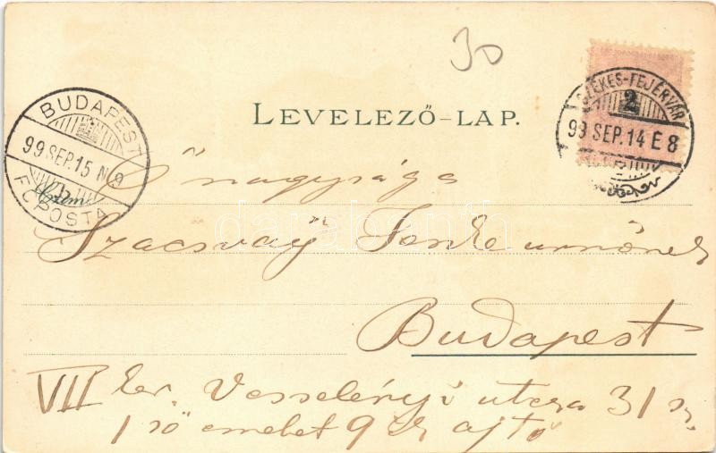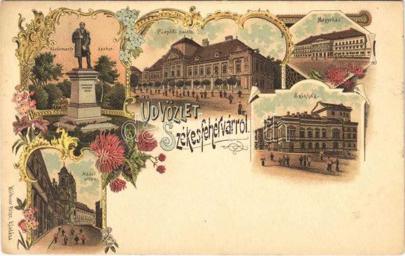 Beschreibung: 1899 Székesfehérvár, Vörösmarty szobor, Püspöki palota, Megyeház, Színház, Nádor utca. Klökner Péter kiadása. Art Nouveau, floral, litho