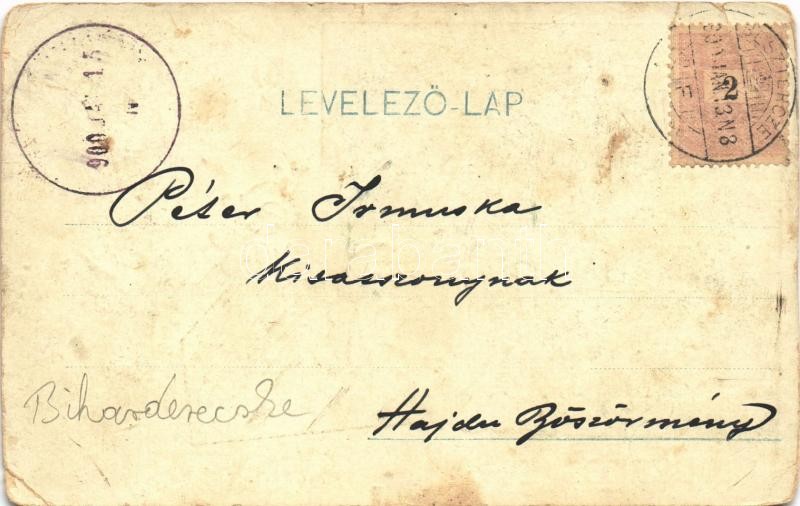 Beschreibung: 1900 Derecske, Szarka vendéglő, étterem, Városháza, Református templom. Floral (b)