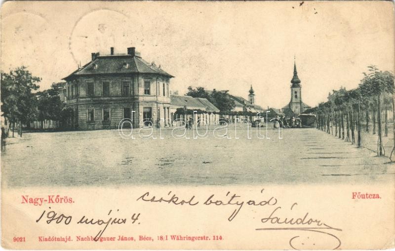 Beschreibung: 1900 Nagykőrös, Fő utca, Gyógyszertár, templomok, piac. Nachbargauer János kiadása (EM)
