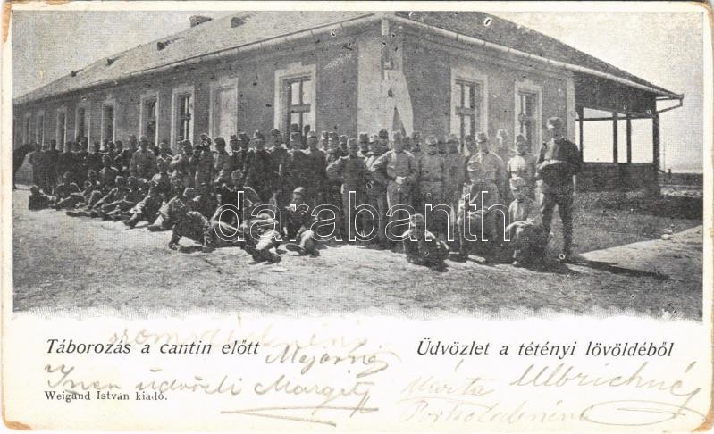 Beschreibung: 1903 Budapest XXII. Kistétény, Budatétény; Lövölde, Táborozás a kantin előtt, K.u.K. katonák. Weigand István kiadása (kopott sarkak / worn corners)