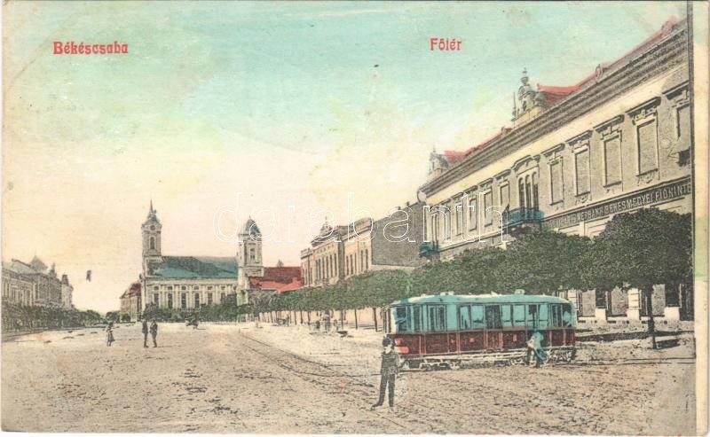 Beschreibung: 1909 Békéscsaba, Fő tér, motor, városi vasút, kisvasút, templom, Népbank