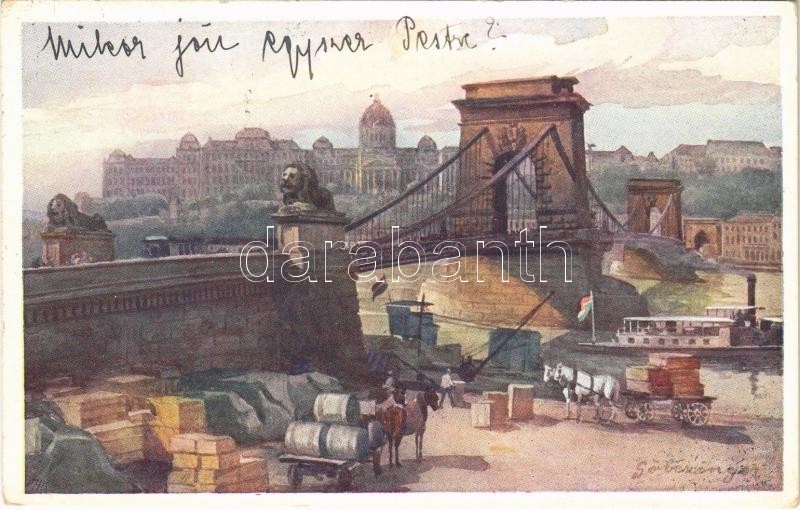 Beschreibung: 1912 Budapest, Lánchíd és Királyi vár, rakpart. B.K.W.I. S. 280/14. s: Götczinger (EK)
