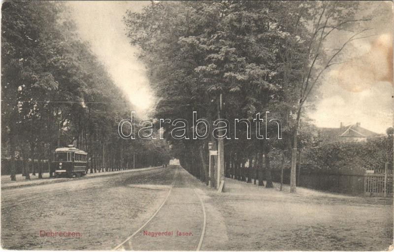 Beschreibung: 1913 Debrecen, Nagyerdei fasor, villamos. Ifj. Gyürky Sándor kiadása (ázott / wet damage)