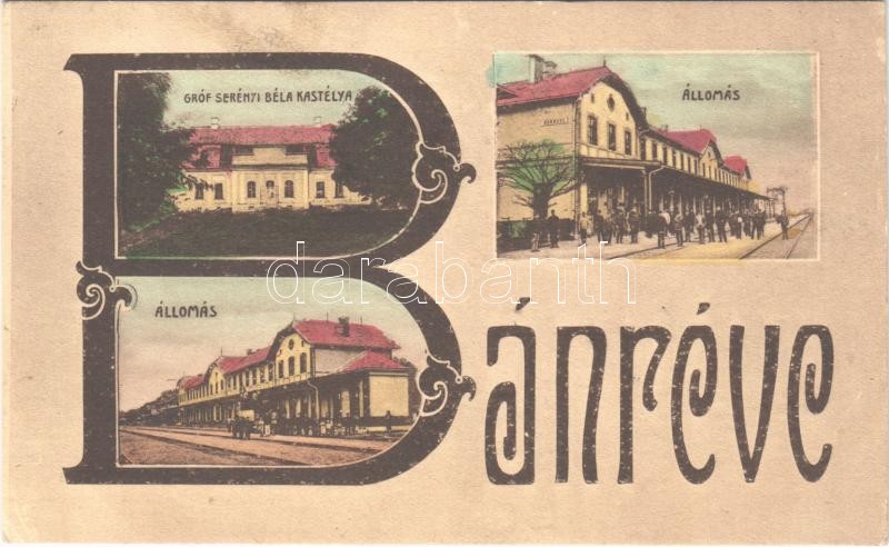Beschreibung: 1916 Bánréve, Gróf Serényi Béla kastélya, vasútállomás. Iniciálés szecessziós lap. Vasúti levelezőlapárusítás 2880. (EK)