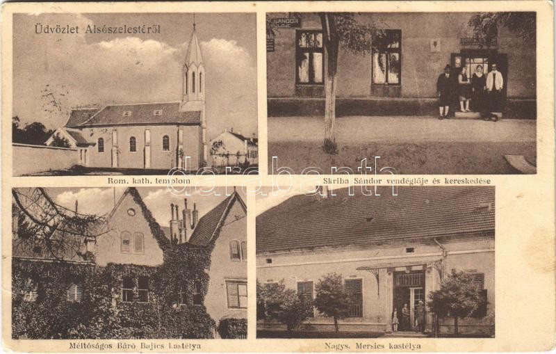 1938 Alsószeleste (Szeleste), Római katolikus templom, Báró Bajics kastélya, Mersics kastélya, Skriba Sándor vendéglője és üzlete. Szilágyi Arthur műterméből (EB)