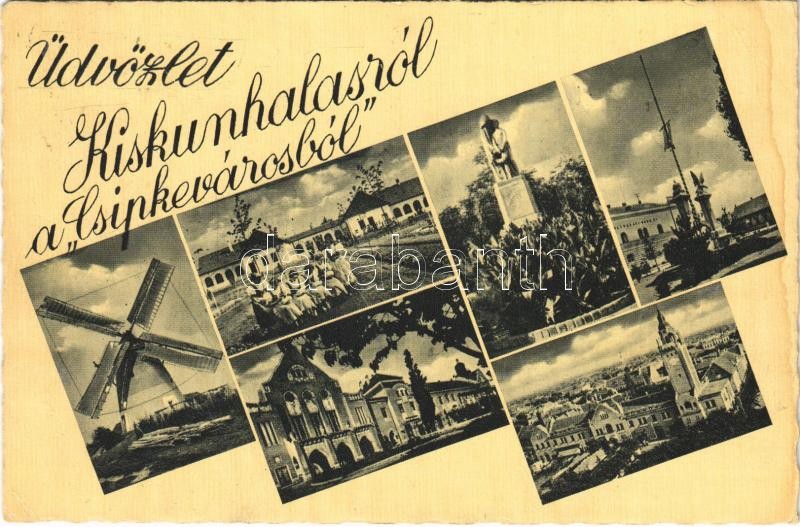 Beschreibung: 1944 Kiskunhalas, Üdvözlet a "Csipkevárosból"! Szélmalom, Országzászló, Városháza (EK)