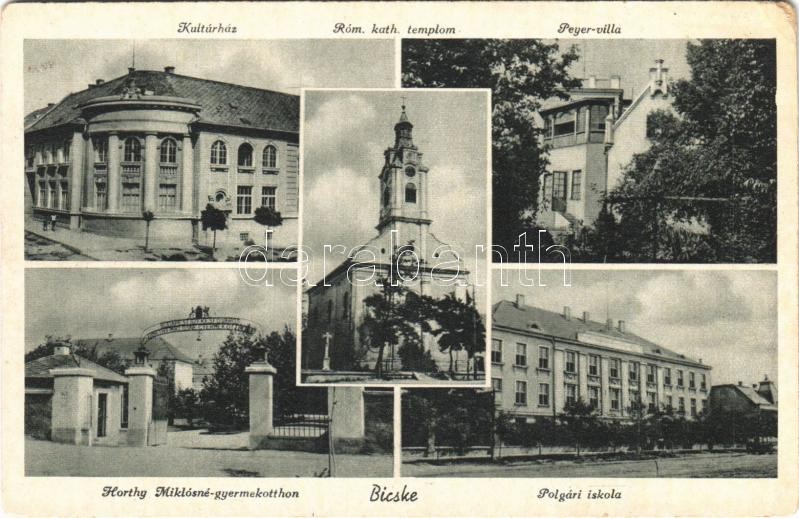 Beschreibung: Bicske, Horthy Miklósné gyermekotthon, Kultúrház, Római katolikus templom, Peyer villa, Polgári iskola (EK)