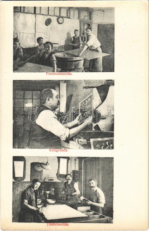 Beschreibung: Budapest (?), Üveggyári kisüzem részletek, belső, finomcsiszolás, virágvésés, tükörborítás