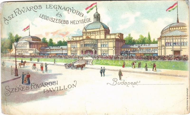 Beschreibung: Budapest XIV. Városliget, Székesfővárosi Pavilon, Bokor János vendéglője, étterem, Weingruber Ignác kávéháza, kerékpárosok, hintó. Kosmos litho (r)