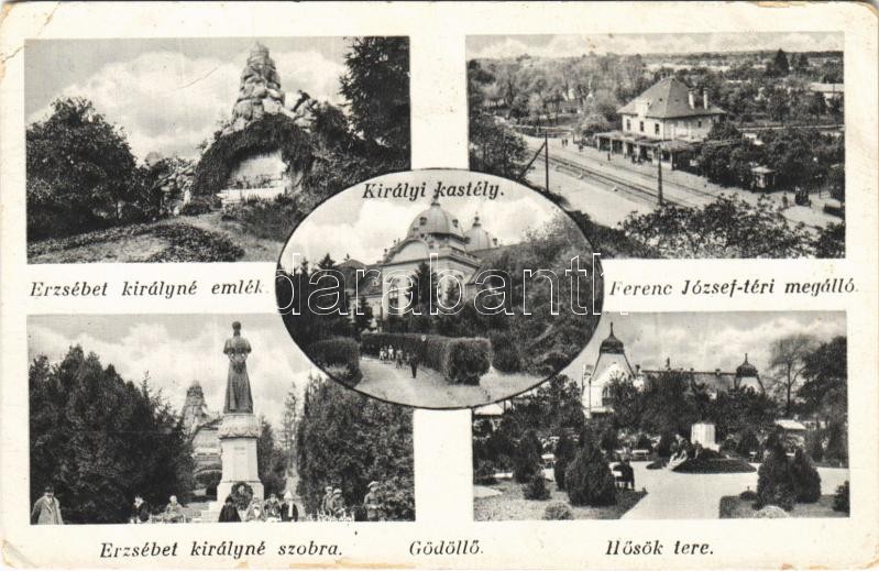 Beschreibung: Gödöllő, Erzsébet királyné emlékmű és szobor, Ferenc József téri megállóhely, HÉV villamos vasútállomás, Hősök tere, Királyi kastély (EK)