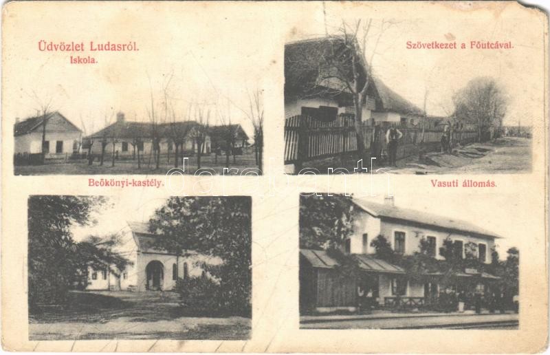 Beschreibung: Ludas, Iskola, Beökönyi kastély, vasútállomás, Fő utca, Szövetkezet üzlete és saját kiadása (EM)