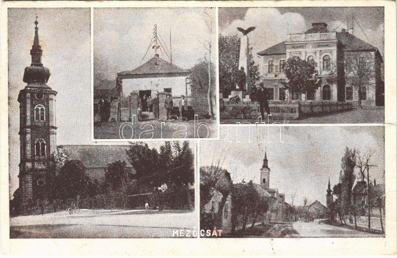 Beschreibung: Mezőcsát, Református templom, Községháza, Hősök szobra, Fő utca. Kerékgyártó István kiadása (vágott / cut)
