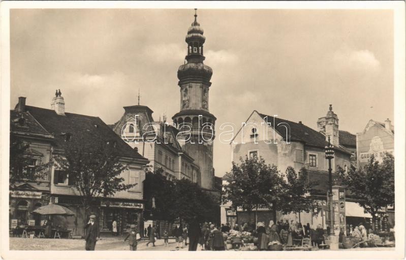 Beschreibung: Sopron, Várkerület és Várostorony, piac árusokkal, Bader Gusztávné, Fischer, Steinbach Károly, Knop Ignác és Gruber üzlete