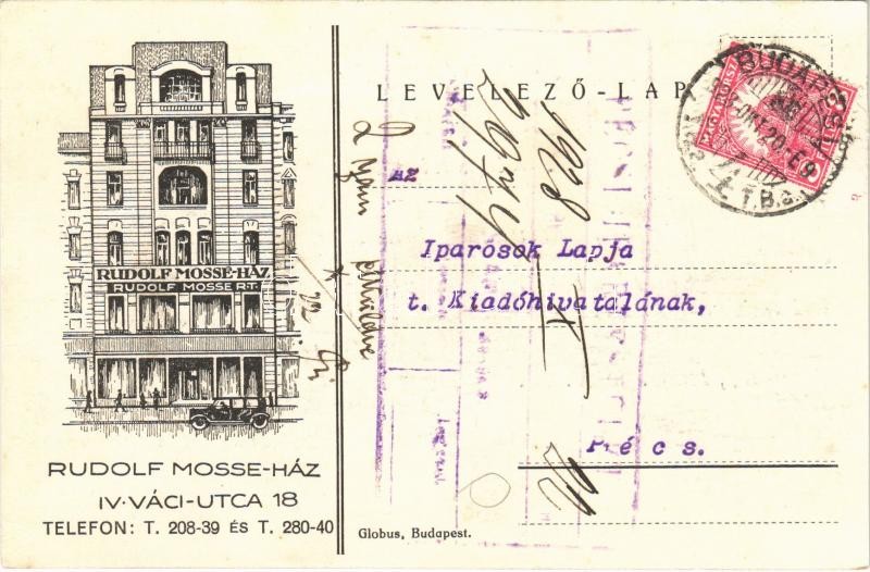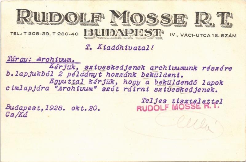 1928 Budapest V. Rudolf Mosse Ház. Váci utca 18. reklám (EK) https://www.darabanth.com/de/401-Fernauktion/401.0/Ansichtskarten/Werbungen~1500090/1928-Budapest-V-Rudolf-Mosse-Haz-Vaci-utca-18-reklam-EK~II2465035