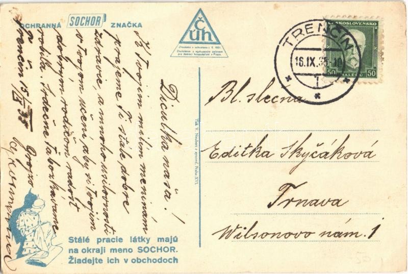 Beschreibung: 1935 Doprajte si siat novych z dobrych látok Sochorovych. Ochranná Sochor Znacka. Karol Schlesinger (Trencín) / Czechoslovak fabrics brand advertisement card (fl)