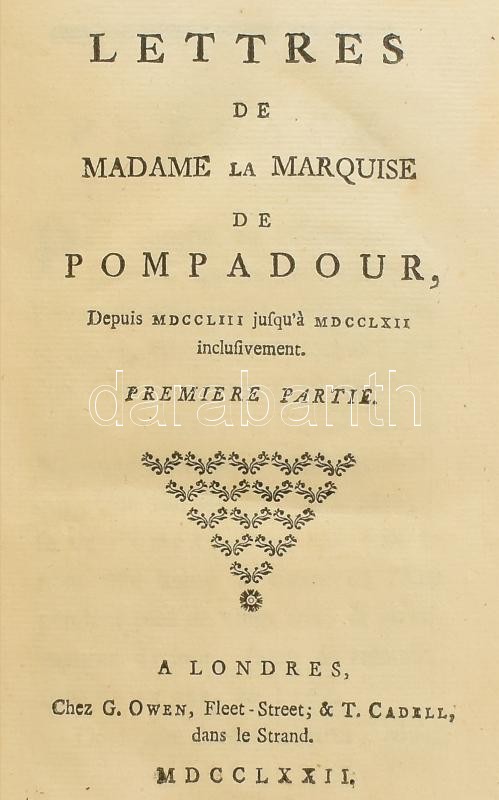 Lettres de Madame la Marquise de Pompadour I.-II. . Londres, 1777. G. Owen. + hozzákötve: Lettres et réponsen écrites á madame la marquise de Pompadur, Londres 1777. G. Owen. Korabeli aranyozott, félvászon kötésben Jó állapotban