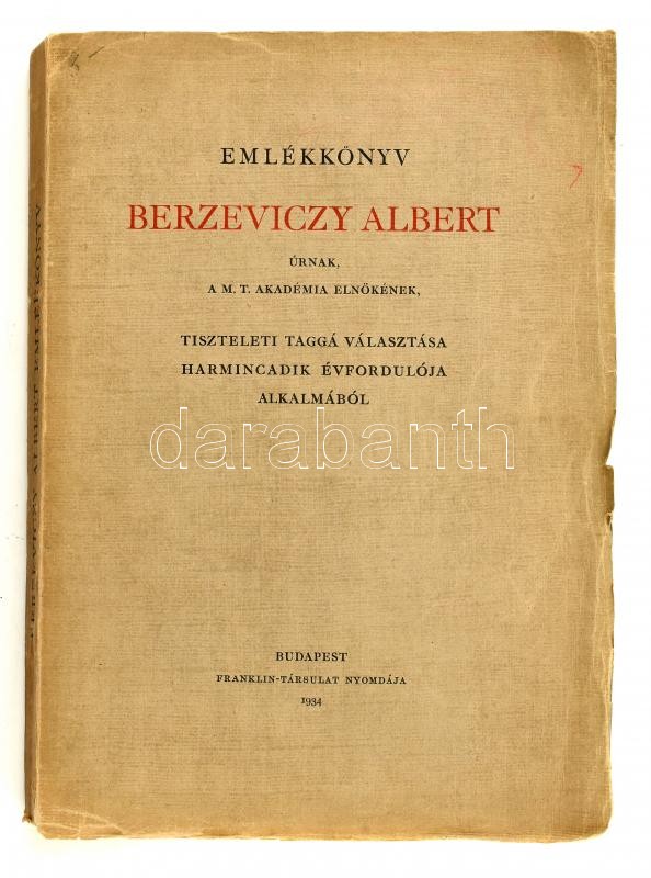 Emlékkönyv Berzeviczy Albert úrnak, a M. T. Akadémia elnökének, tiszteltei taggá választása harmincadik évfordulója alkalmából. Bp., 1934, Franklin. Kiadói szakadt papírkötés, kopottas állapotban.