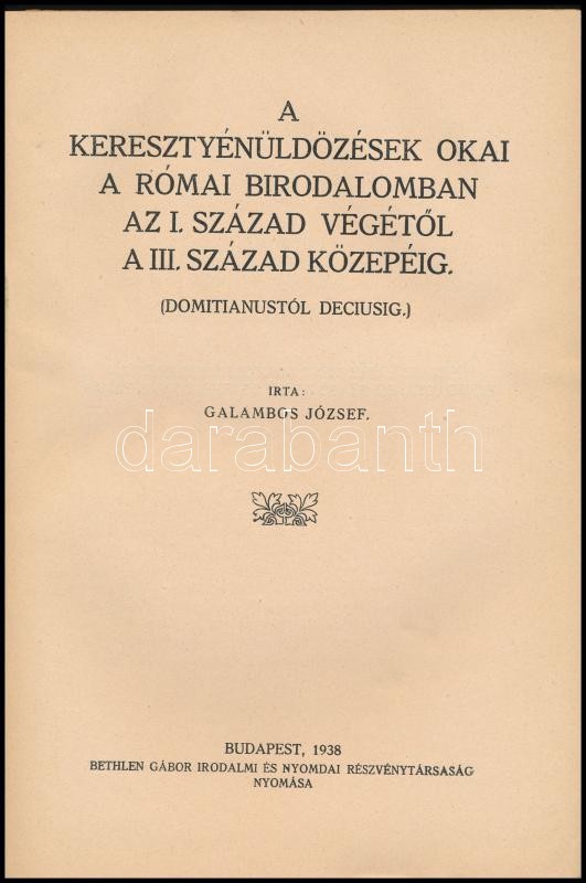 Galambos József: A keresztényüldözések okai a római birodalomban az I. század közepétől a III. század közepéig. (Domitianustól Deciusig). Bp., 1938, Bethlen Gábor Irodalmi és Nyomdai Rt. 92p. Kiadói papírkötés