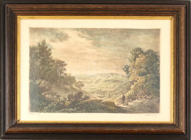 Színezett rézkarc, papír, üvegez... https://www.darabanth.com/de/401-Fernauktion/401.0/Gemalde-und-Grafiken/Gemalde-und-Grafiken~500001/Paulovits-Pal-1892-1975-Hazafele-Szinezett-rezkarc-papir-uvegezett-keretben-jelzett-3~II2458079