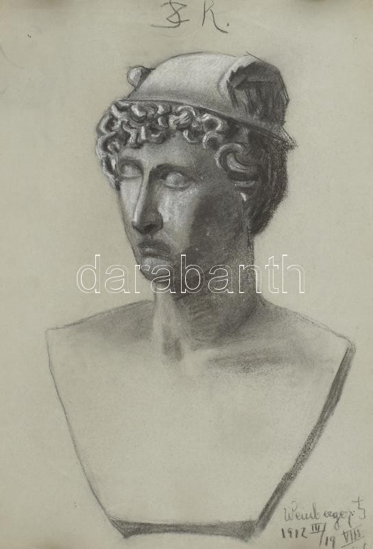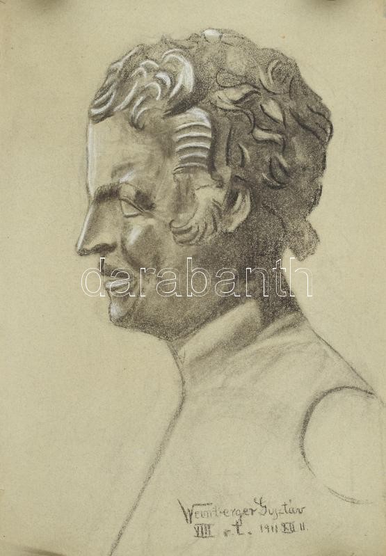 Weinberger Gusztáv - 7 db tanulmány, szén, fedőfehér, papír. Jelzett, sérült, keret nélkül. 47x32 cm - Voltaire, Férfi torzó, Hermész (hátulján Mona Lisa tanulmány), Madonna, császár portré, fejtanulmány Leonardo után.