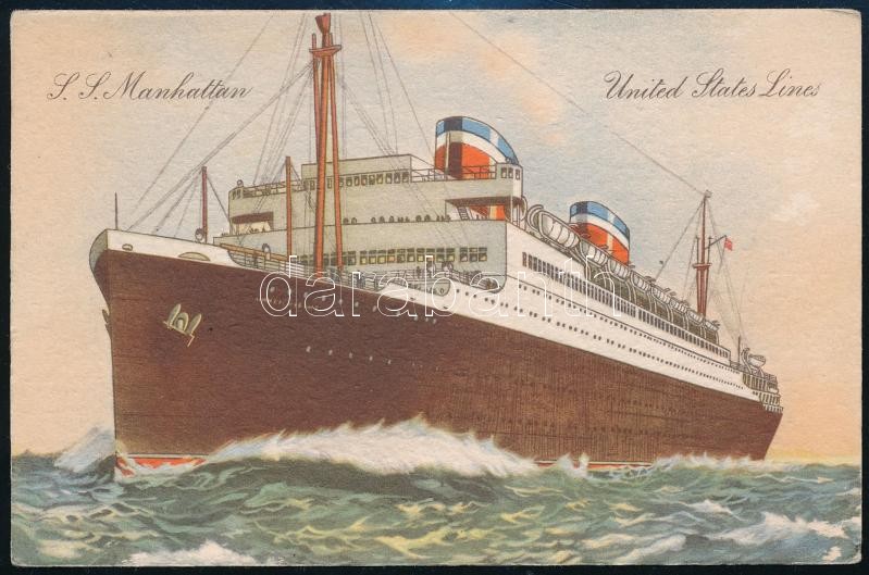 Beschreibung: SS Manhatten hajó, mely 88 kísérő nélküli, a náci Németországból menekülő zsidó gyermeket szállított Southamptonba, képeslap, 9×13 cm