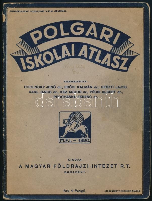 1942 Polgári Iskolai Atlasz. Szerk.: Cholnoky Jenő, Erődi Kálmán, Geszti Lajos, Karl János, Kéz Andor, Pécsi Albert, Prochaska Ferenc. Harmadik kiadás. Bp., Magyar Földrajzi Intézet Rt., kissé sérült, foltos borítóval, 32 p.