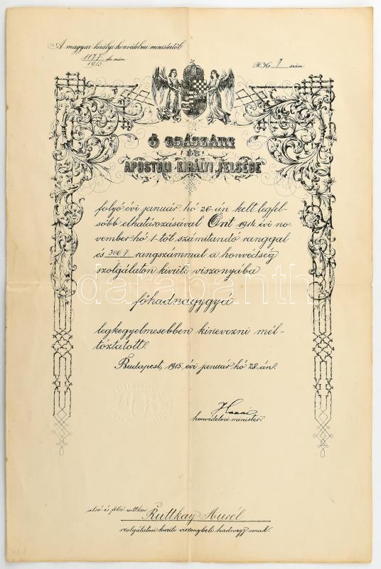 1915 Bp., M. kir. honvédelmi miniszter által kiadott főhadnagyi kineve... https://www.darabanth.com/de/401-Fernauktion/401.0/Kunst-Dokumente-andere-Sammelgebiete/Militaria~500027/1915-Bp-M-kir-honvedelmi-miniszter-altal-kiadott-fohadnagyi-kinevezes~II2464589