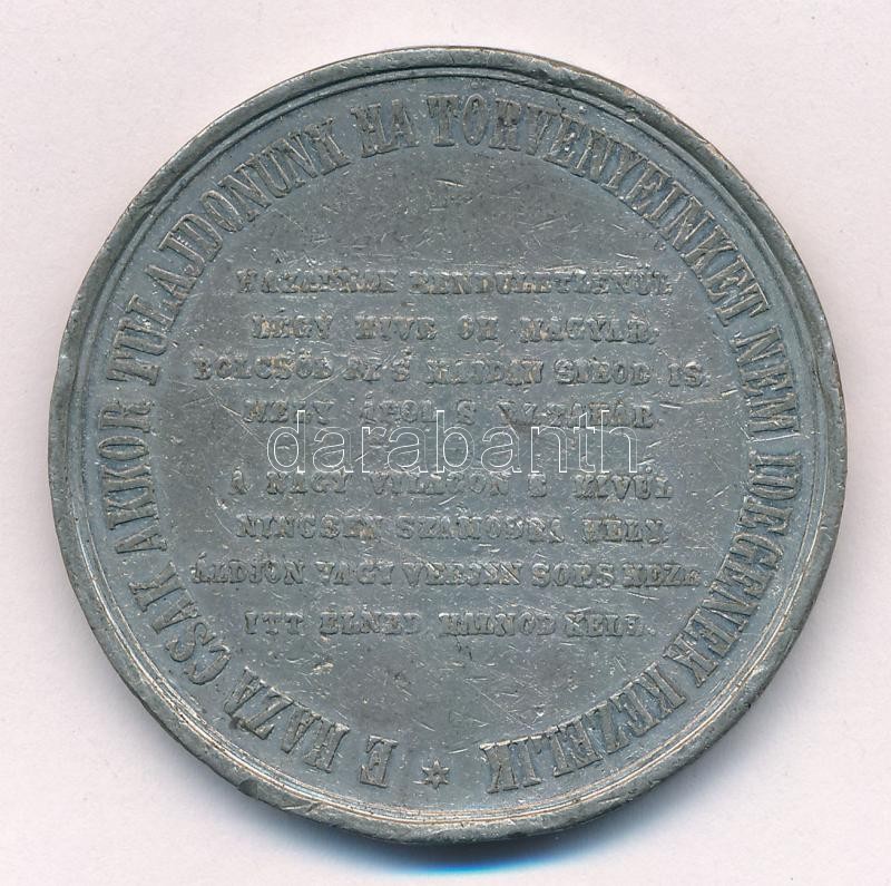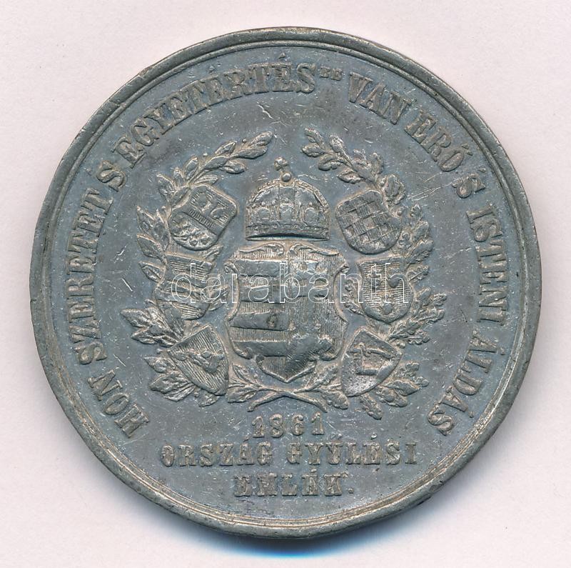 1861. "Országgyűlési Emlék" Sn emlékérem. "HON SZERETET 'S EGYETÉRTÉSBE VAN ERŐ 'S ISTENI ÁLDÁS - 1861 ORSZÁG GYŰLÉSI EMLÉK / E HAZA CSAK AKKOR TULAJDONUNK HA TÖRVÉNYEINKET NEM IDEGENEK KEZELIK - HAZÁDNAK RENDÜLETLENÜL LÉGY HÍVE....". (50mm) T:1- Hungary 1861. Sn commemorative medallion of the Diet of 1861. "HON SZERETET 'S EGYETÉRTÉSBE VAN ERŐ 'S ISTENI ÁLDÁS - 1861 ORSZÁG GYŰLÉSI EMLÉK / E HAZA CSAK AKKOR TULAJDONUNK HA TÖRVÉNYEINKET NEM IDEGENEK KEZELIK - HAZÁDNAK RENDÜLETLENÜL LÉGY HÍVE....". (50mm) C:AU