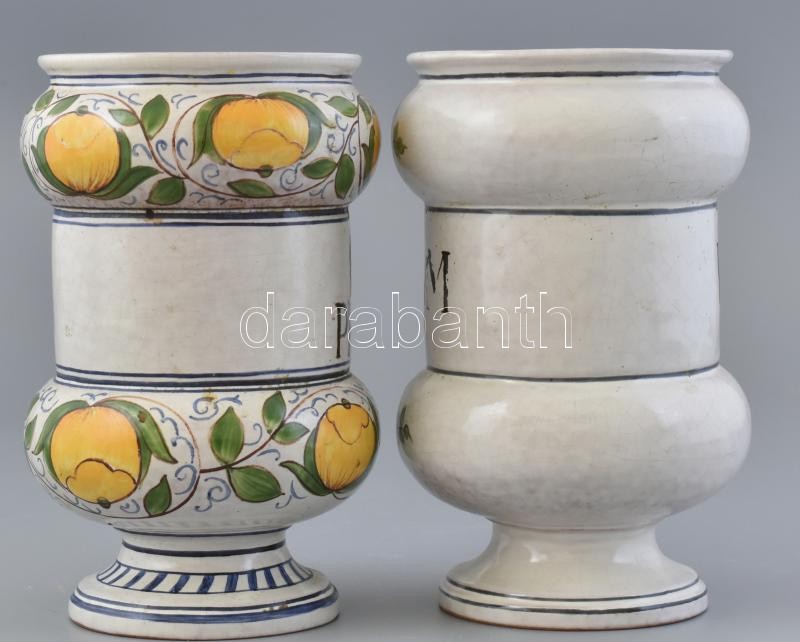 Beschreibung: Régi patika edény 2 db, kézzel festett mázas kerámia, kopott, jelzett: MEDIMPEX BUDAPEST VIB m: 17,5 cm
