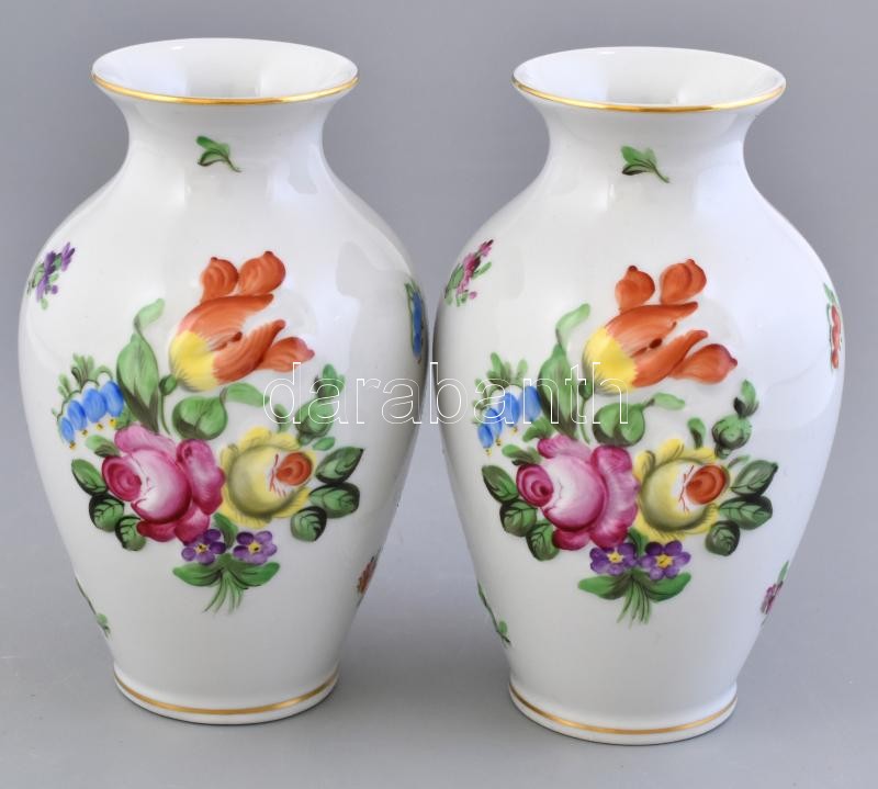 Beschreibung: Herendi porcelán vázapár, kézzel festett, reliefszerű virág dekorral, jelzett, kis kopásnyomokkal, m: 14 cm