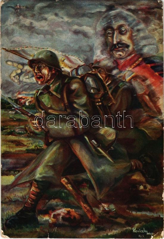 1935 "Ne bántsd a magyart!" (Zrínyi) M. kir. "Zrínyi Miklós" 7. honvéd gyalogezred. Keviczky Kálmán hadnagy olajfestménye / Hungarian military art postcard s: Keviczky (EB)