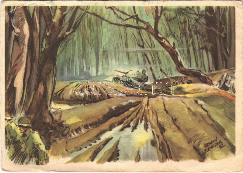 Beschreibung: 1944 Aus dem Wald von Kolodesy / WWII German military art postcard, tank s: Schneider (EB)