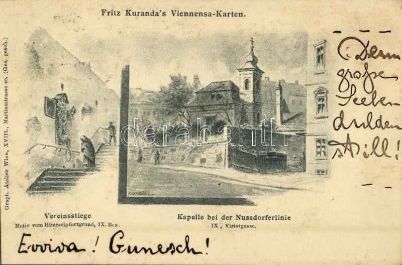 Beschreibung: 1897 Vienna, Wien, Bécs IX. Vereinsstiege, Kapelle bei der Nussdorferlinie, Fritz Kuranda's Viennensa-Karten / stairs, chapel (fl)