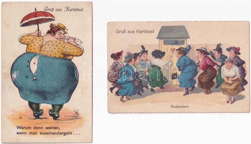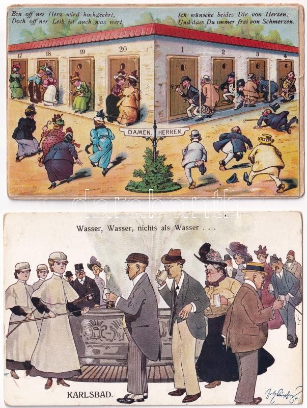 4 db RÉGI humoros képeslap Karlsbad-ból: wécére szaladó fürdővendégek / 4 pre-1945 humorous postcards from Karlovy Vary: spa guests runinng to the toilet