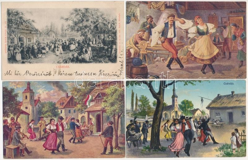 Beschreibung: 4 db régi magyar folklór képeslap: csárdás / 4 pre-1945 Hungarian folklore postcards: traditional dance