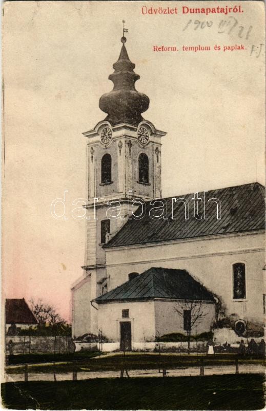 Beschreibung: 1900 Dunapataj, Református templom és paplak. Klein J. fényképész felvétele. Faragó Gergely kiadása (EK)