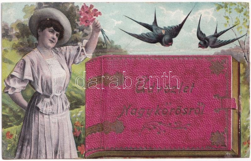 Beschreibung: 1911 Nagykőrös, leporello hölggyel és fecskékkel (r)