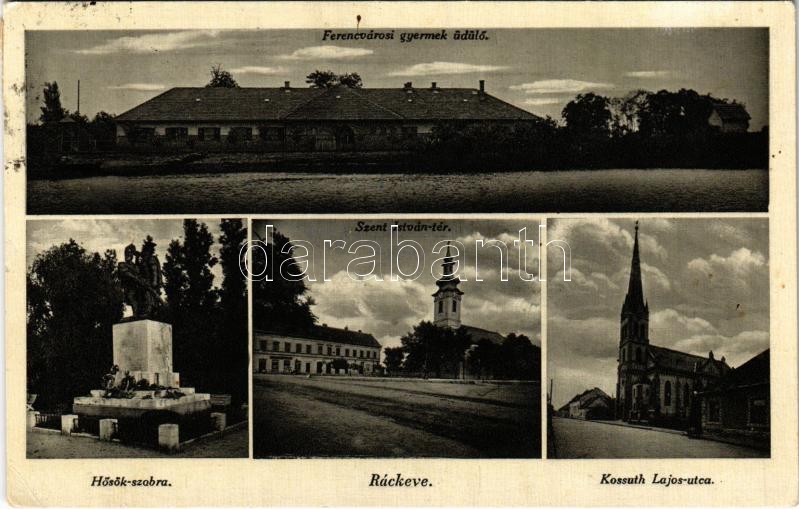 1942 Ráckeve, Ferencvárosi gyermek üdülő, Hősök szobra, emlékmű, Szent István tér, Kossuth Lajos utca, Római katolikus templom, Református templom. F. Kenessey György kiadása (EK)
