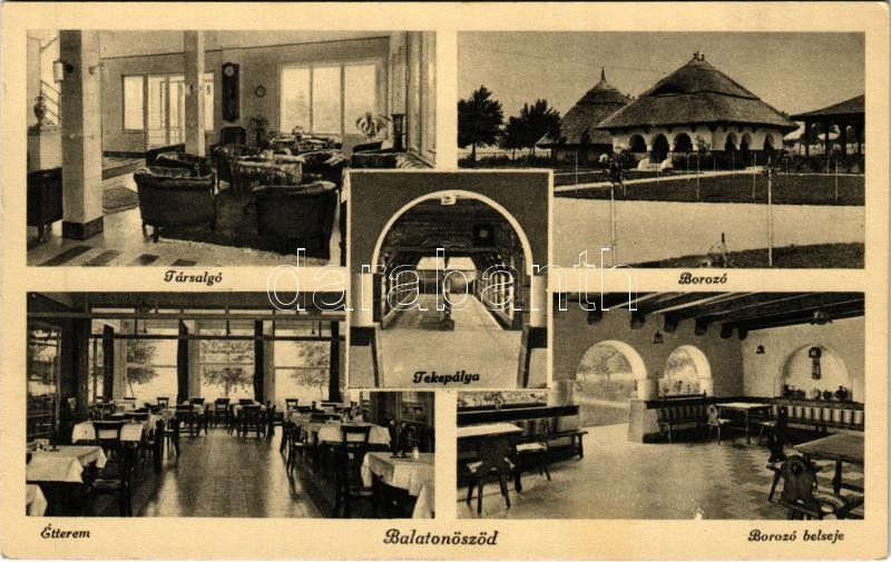 Beschreibung: Balatonőszöd, M. kir. Ipari és Kereskedelmi Minisztérium Tisztviselői Jóléti Egyesületének üdülőtelepe. Társalgó, borozó, tekepálya, étterem, belsők
