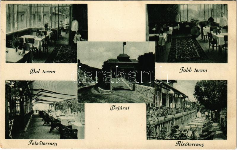 Beschreibung: Budapest XII. Farkasvölgy, Gruber Emil féle Ördögorom csárda, étterem, bejárat, bal és jobb terem, alsó és felső terasz, belső
