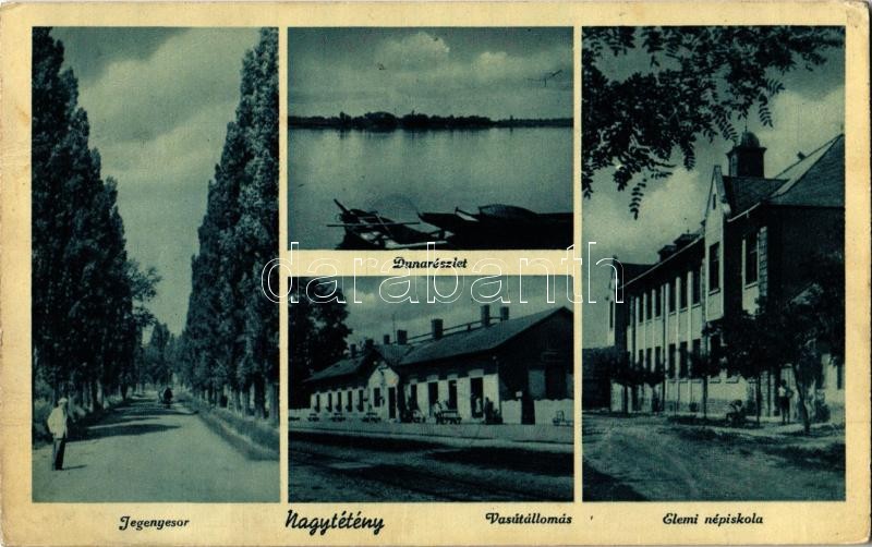 Beschreibung: Budapest XXII. Nagytétény, Jegenyesor, Vasútállomás, Duna részlet, csónakok, Elemi iskola. Dr. Pencz Ferencné kiadása (EK)