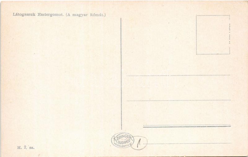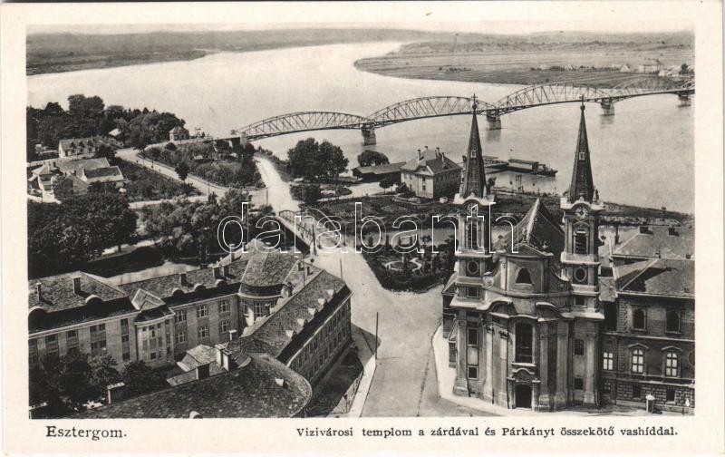 Beschreibung: Esztergom, Vízivárosi templom a zárdával és Párkányt összekötő vashíddal. "Látogassuk Esztergomot (A magyar Rómát)"