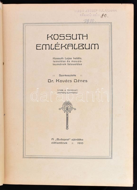Kossuth Emlékalbum. Kossuth Lajos halála, temetése és mauzoleumának felavatása. Szerk.: Dr. Kovács Dénes. A "Budapest" ajándéka előfizetőinek. Bp., 1910,"Budapest", 231 p. Fekete-fehér képekkel, fotókkal, valamint három színes műmelléklettel. Kiadói aranyozott egészvászon-kötés, kopott borítóval.